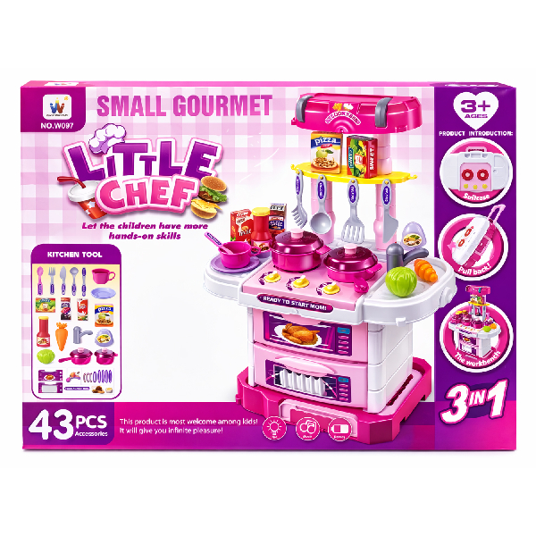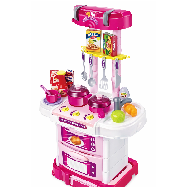 Cocinita infantil plegable que se transforma en práctico maletín, ideal para transportar y guardar fácilmente después del juego. Diseñada para brindar una experiencia interactiva, incorpora luces y sonidos funcionales que aportan mayor realismo y diversión.