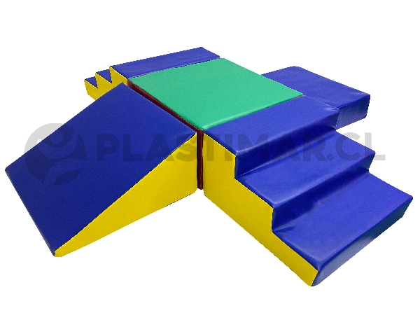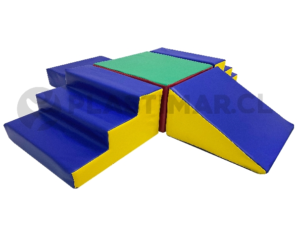 2 escalas de 3 peldaños, 1 cuadrado grande, 1 cuadrado chico y 1 rampa.