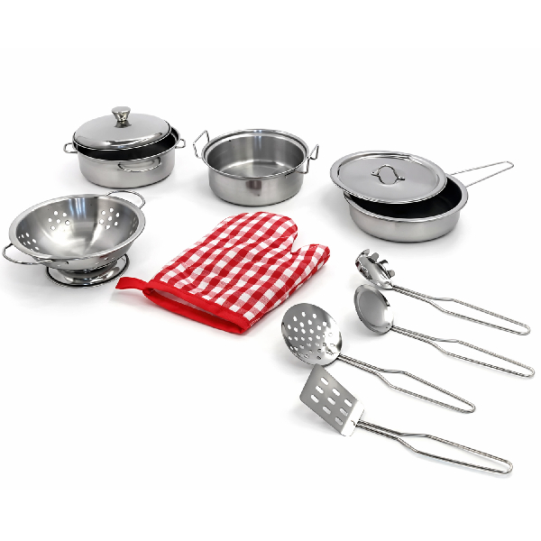 Set de batería de cocina de acero inoxidable ideal para el juego simbólico y la recreación de actividades cotidianas. Favorece el desarrollo de la convivencia escolar, el trabajo colectivo, las habilidades sociales y el juego de roles, promoviendo la imaginación y la interacción en dinámicas individuales o grupales.