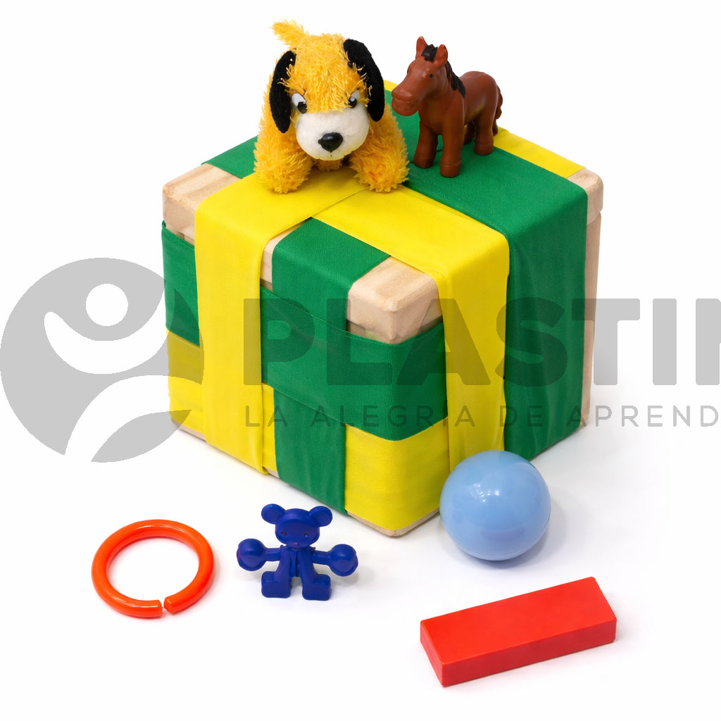 Caja de madera de clasificación compuesta por un cubo rodeado de bandas elásticas gruesas de 5 cm de ancho, formando un sistema flexible que permite introducir y extraer objetos a través de sus caras. Incluye 6 piezas de diferentes formas y texturas, tales como 1 pelota plástica de 6 cm, 1 animalito de tela, 1 animalito plástico, 1 argolla plástica, entre otros elementos de aproximadamente 5 a 6 cm. Favorece el desarrollo de habilidades motoras finas, la curiosidad, la exploración táctil, la experimentación y el aprendizaje causa-efecto.