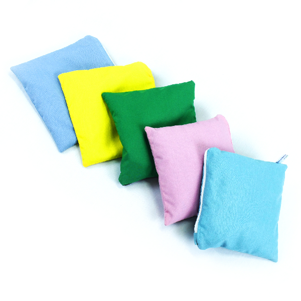 5 cojines sensoriales cuadrados en distintos colores, con rellenos variados (semillas, trigo, arroz, porotos, algodón, espuma, entre otros).