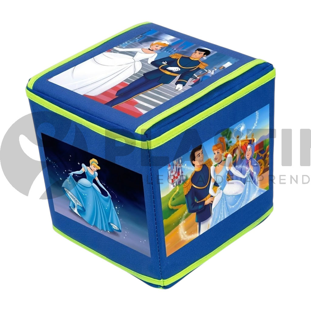 Cubo con bolsillo en cada una de sus caras y set de 6 tarjetas de papel couché termolaminado de 18 x 18 cm, impresas por ambos lados (12 imágenes diferentes) correspondientes a un cuento infantil. Recurso ideal para incentivar la creación de historias, favoreciendo el desarrollo de la redacción, la creatividad y las interacciones grupales.