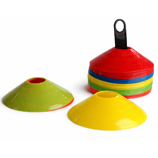 50 conos tipo lenteja en colores amarillo, azul, rojo, verde y naranjo.