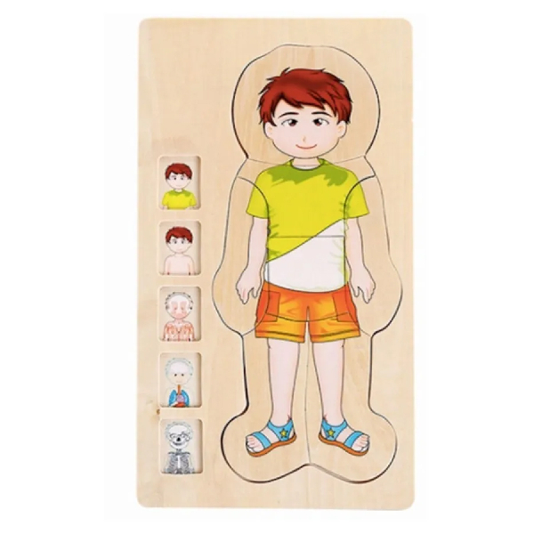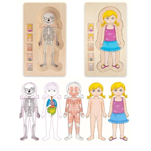Cada puzle representa una parte distinta del cuerpo: ropa, piel, músculos, órganos internos y huesos, facilitando la comprensión de las estructuras corporales y promoviendo el pensamiento lógico, la concentración y la motricidad fina.