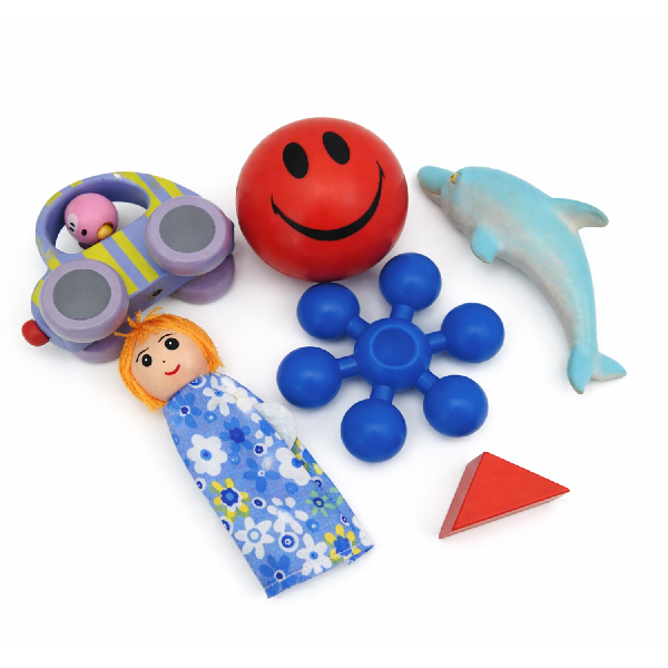 6 piezas de diferentes texturas: pelota de caucho, auto de madera, títere de dedo, animal de plástico, estrella conectable y figura geométrica de madera.