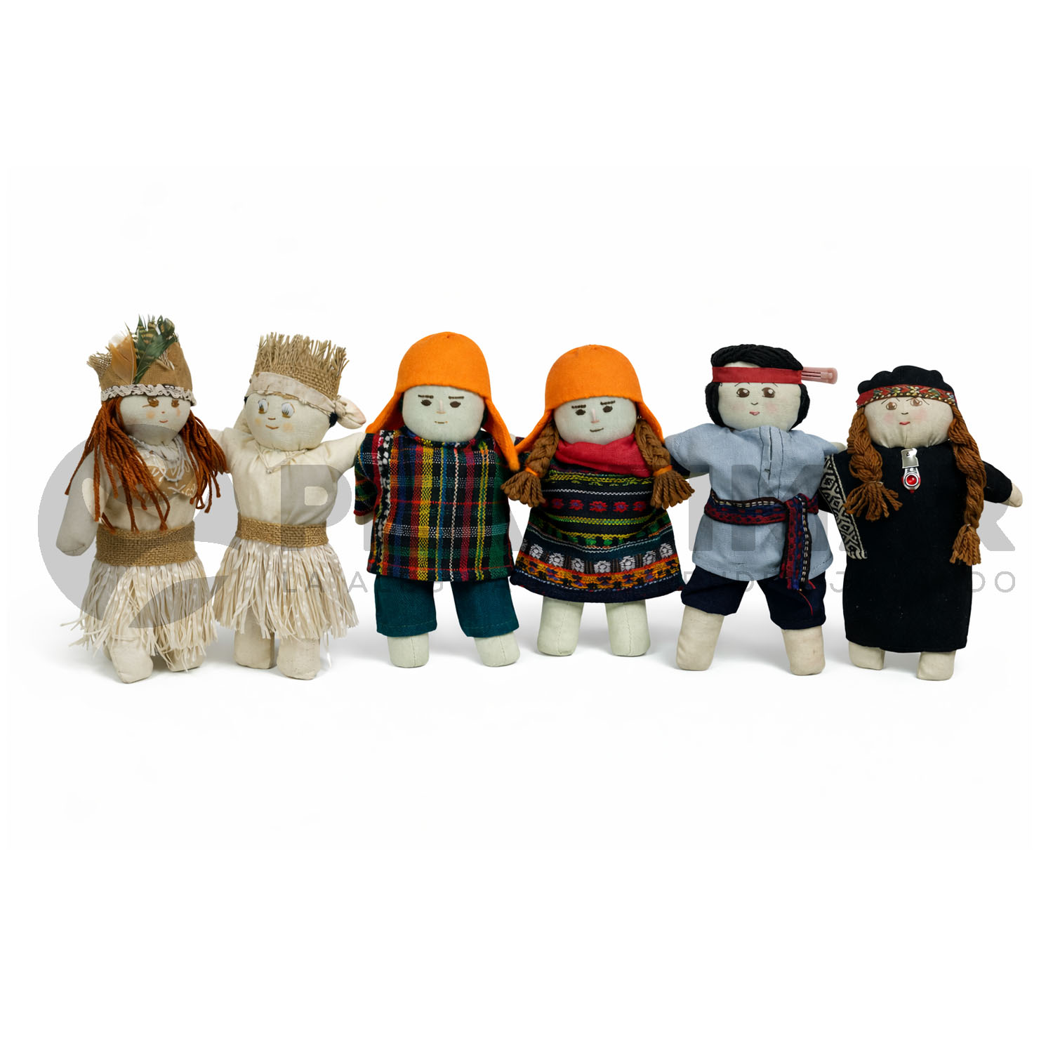 Set de 6 títeres de mano (3 parejas) de pueblos originarios compuesto por las etnias aymara, mapuche y pascuense, con vestimenta y accesorios típicos de culturas ancestrales que perduran hasta nuestros días. Juguetes textiles con fines educacionales que fomentan el conocimiento de las raíces culturales y la diversidad.
