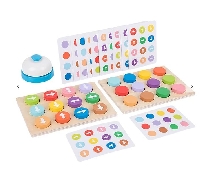 Set de botones para hilar. Ideal para desarrollar la motricidad  fina y la coordinación óculo-manual. Además sirven para clasificar mediante color y cantidad de orificios. Contiene 160 botones de 3,9 cm aprox. de colores surtidos y 8 cordeles. Recomendado para niños desde los 2 años. Presentación en caja plástica.