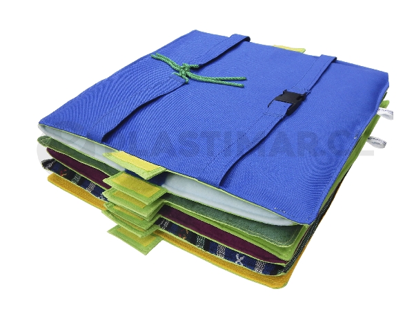 Alfombra sensorial conformada por 7 piezas con diferentes paños y texturas como gamuzina, polar, tul, tela étnica, malla blanda y ecocuero. Todas las texturas son suaves y agradables al tacto, estimulando la exploración sensorial de niños y niñas. Cada cuadrado posee velcros en sus laterales que permiten unir las piezas de distintas formas, generando diversas alternativas de juego. En su parte inferior cada pieza está recubierta con tela ecocuero, cuero sintético de PVC antideslizante que entrega mayor seguridad durante su uso.