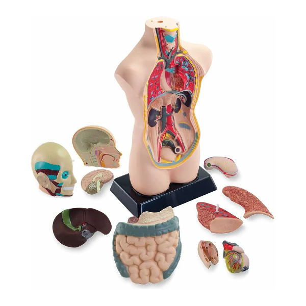 Torso humano de 50 cms. Desarmable en 11 piezas, Pintado a mano con colores naturales y vívidos, con 11 partes desmontables, diseccionables, irrompible, base de ABS y manual de instrucciones a todo color. Por su gran realismo y precisión es ideal para el estudio y comprensión de anatomía humana, y ubicación de cada parte en le tronco del cuerpo. Contiene una cantidad de detalles que incluyen pulmones, corazón, hígado, estómago, intestinos y cabeza. Incluye un manual de instrucciones. Material plástico de alta resistencia.