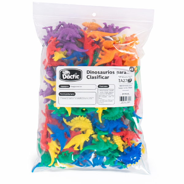 Set de figuras plásticas de dinosaurios, ideal para actividades de clasificación y conteo. Permite desarrollar el razonamiento lógico-matemático mediante la agrupación por color u otros criterios, favoreciendo además la concentración y la motricidad fina.