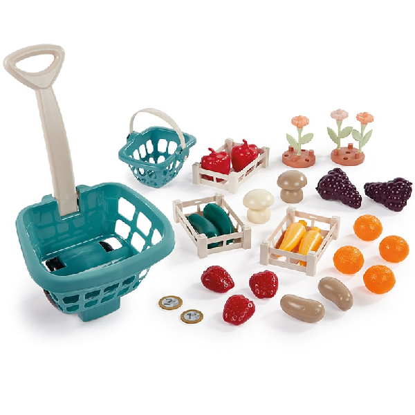 Incluye estructura de puesto de mercado, canasta, carro de compras y cajones con accesorios que representan zanahorias, zapallos italianos, pimentones, papas y champiñones. Se entrega desarmado con instrucciones de ensamblado.