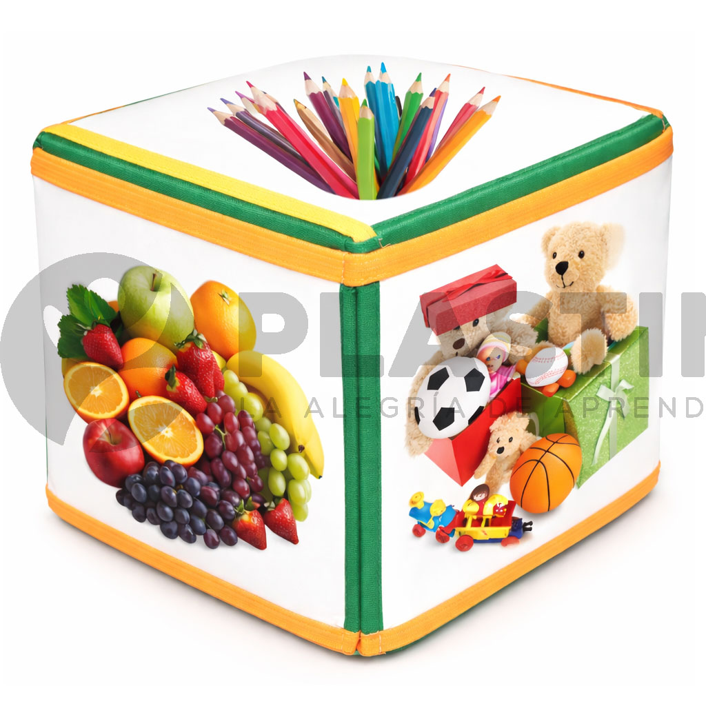 Recurso didáctico en forma de cubo con bolsillo en cada una de sus caras y 6 tarjetas impresas por ambos lados (12 imágenes en total), que permiten a los niños y niñas reconocer objetos de la vida cotidiana infantil como plato, cuna, mochila, zapato, chupete, lápices, mamadera, cepillo de dientes, fruta, mesa y juguetes. Favorece el desarrollo del lenguaje, la memoria, la asociación y la comprensión del entorno.
