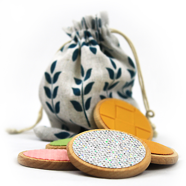 7 piezas sensoriales con diferentes texturas: terciopelo hilado, fibra de carbono, espuma XPE, cuero de grano fino, fieltro, papel de salvado y lino dorado.