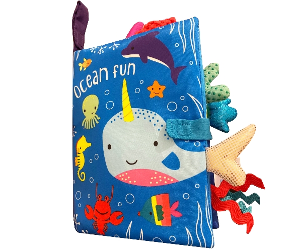 Material didáctico diseñado para la estimulación sensorial temprana en bebés, orientado al reconocimiento de animales marinos a través de sus colas. Incorpora diferentes texturas y elementos sonoros que invitan a la exploración mediante el tacto y el sonido.