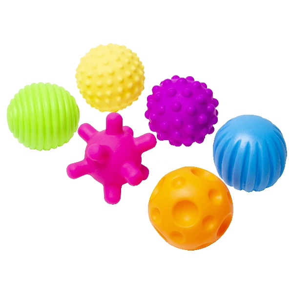 6 pelotas táctiles de diferentes colores, formas y texturas.