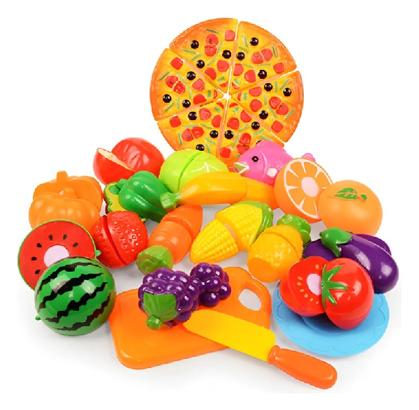 Material didáctico orientado al juego simbólico, que permite a los niños recrear situaciones cotidianas relacionadas con la alimentación. Sus piezas con velcro facilitan la simulación de corte y unión, promoviendo la exploración activa y el aprendizaje mediante el juego.