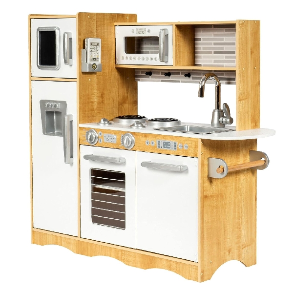 Incorpora horno, encimera, microondas, lavaplatos, refrigerador y estantes, con puertas abatibles que simulan un mobiliario real. Además, cuenta con luces y sonidos que enriquecen la experiencia de juego, haciéndola más interactiva.