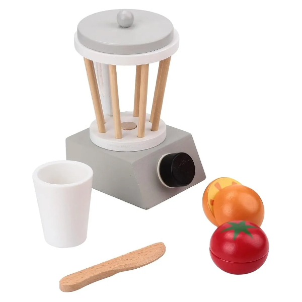 Licuadora de juguete de madera ideal para el juego de simulación en cocina. Incluye exprimidor y batidor como accesorios, permitiendo a niños y niñas recrear actividades cotidianas mientras desarrollan la creatividad, la imaginación y el juego de roles.