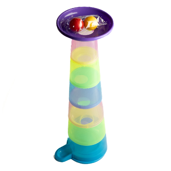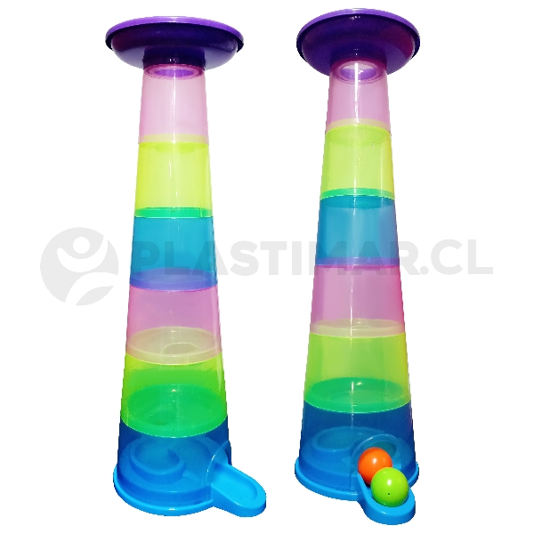 Material didáctico orientado a la exploración sensorial y al desarrollo de la coordinación motriz en etapas iniciales. Su estructura de 6 pisos permite el armado vertical y la experimentación con el desplazamiento de las bolas desde la parte superior, favoreciendo el aprendizaje a través de la observación directa.