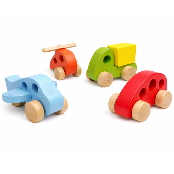 Material didáctico orientado al reconocimiento de medios de transporte y al desarrollo del juego simbólico en contextos educativos y recreativos. Su diseño en madera natural pintada facilita la manipulación y exploración por parte de los niños.