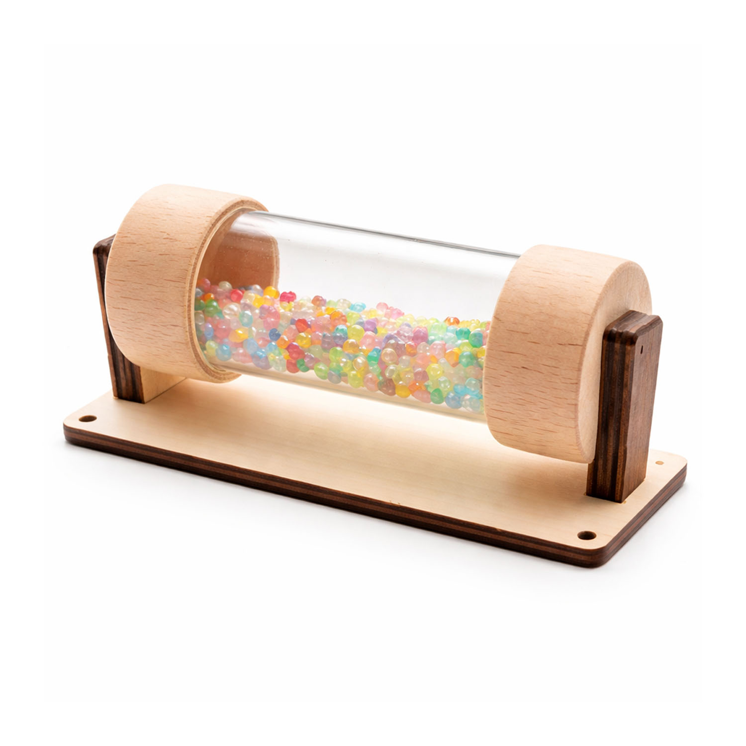 Material didáctico diseñado para la estimulación temprana, que combina elementos visuales y auditivos para favorecer la exploración sensorial. Al girar el bastidor, las cuentas generan un sonido suave tipo lluvia, estimulando la percepción auditiva y la atención.