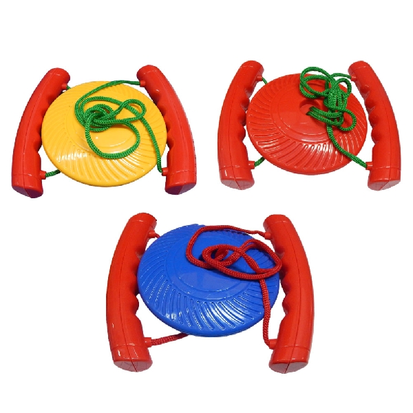 Elemento recreativo diseñado para actividades de coordinación y movimiento, compuesto por un disco central y dos manillas unidas por cuerdas. Al extender las cuerdas, el disco gira, generando una dinámica que estimula la interacción y el control del movimiento.