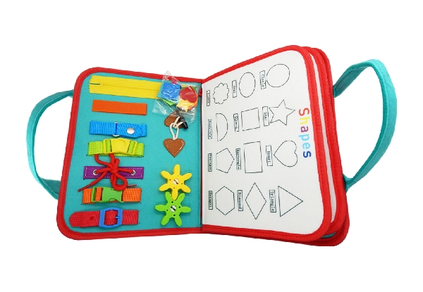 Material didáctico diseñado para el desarrollo de habilidades motrices finas a través de la manipulación de múltiples elementos interactivos. Su formato tipo libro facilita el aprendizaje activo mediante actividades que simulan acciones cotidianas.