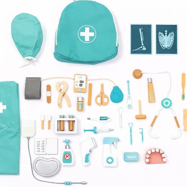 Completo set médico de madera ideal para el juego de roles, permitiendo a niños y niñas desarrollar la imaginación, la creatividad y habilidades sociales a través de la representación de situaciones médicas. Favorece la motricidad fina y la coordinación ojo-mano mediante la manipulación de cada accesorio.