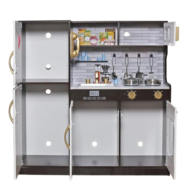 Cuenta con horno, dos quemadores, lavamanos, microondas y varios gabinetes de almacenamiento. Las puertas se abren y las perillas giran, ofreciendo una experiencia de juego interactiva y realista.