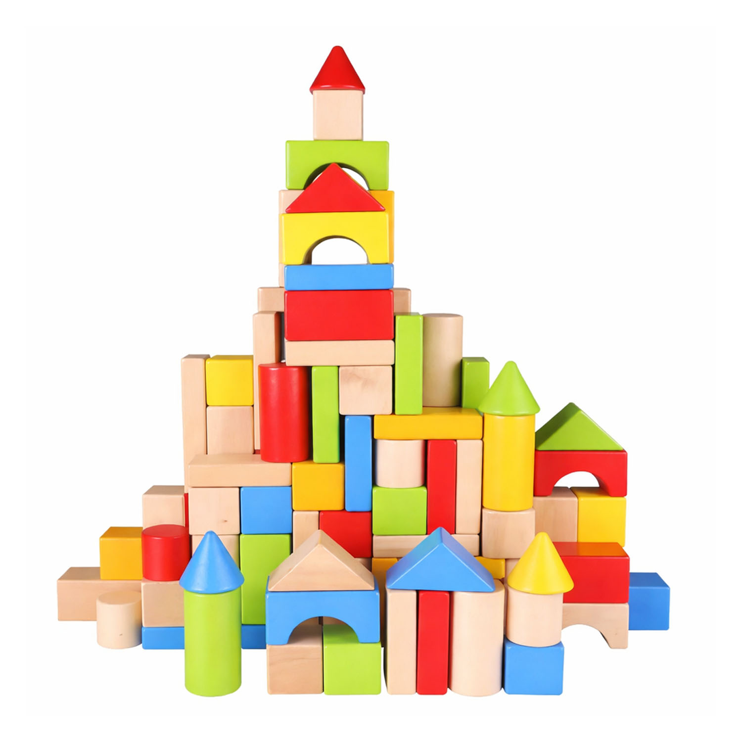 100 bloques geométricos de madera en distintos colores y formas.
