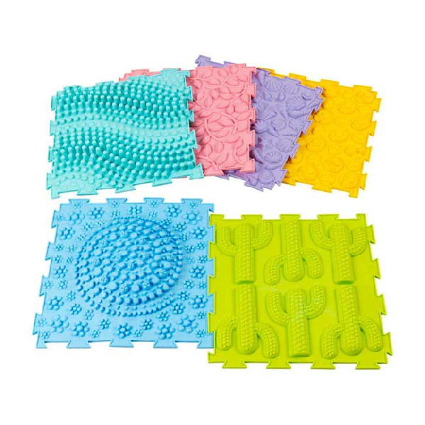 6 piezas conectables con diferentes texturas y colores.