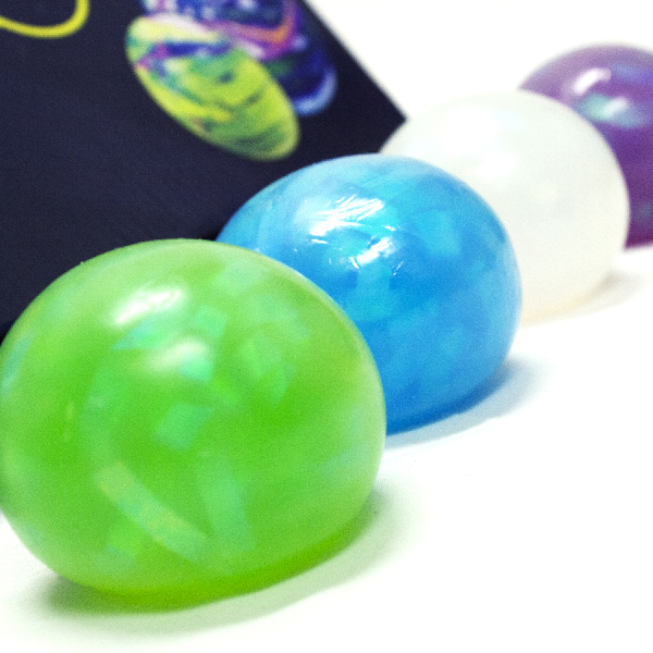 12 pelotas squish sensoriales con glitter en distintos colores.