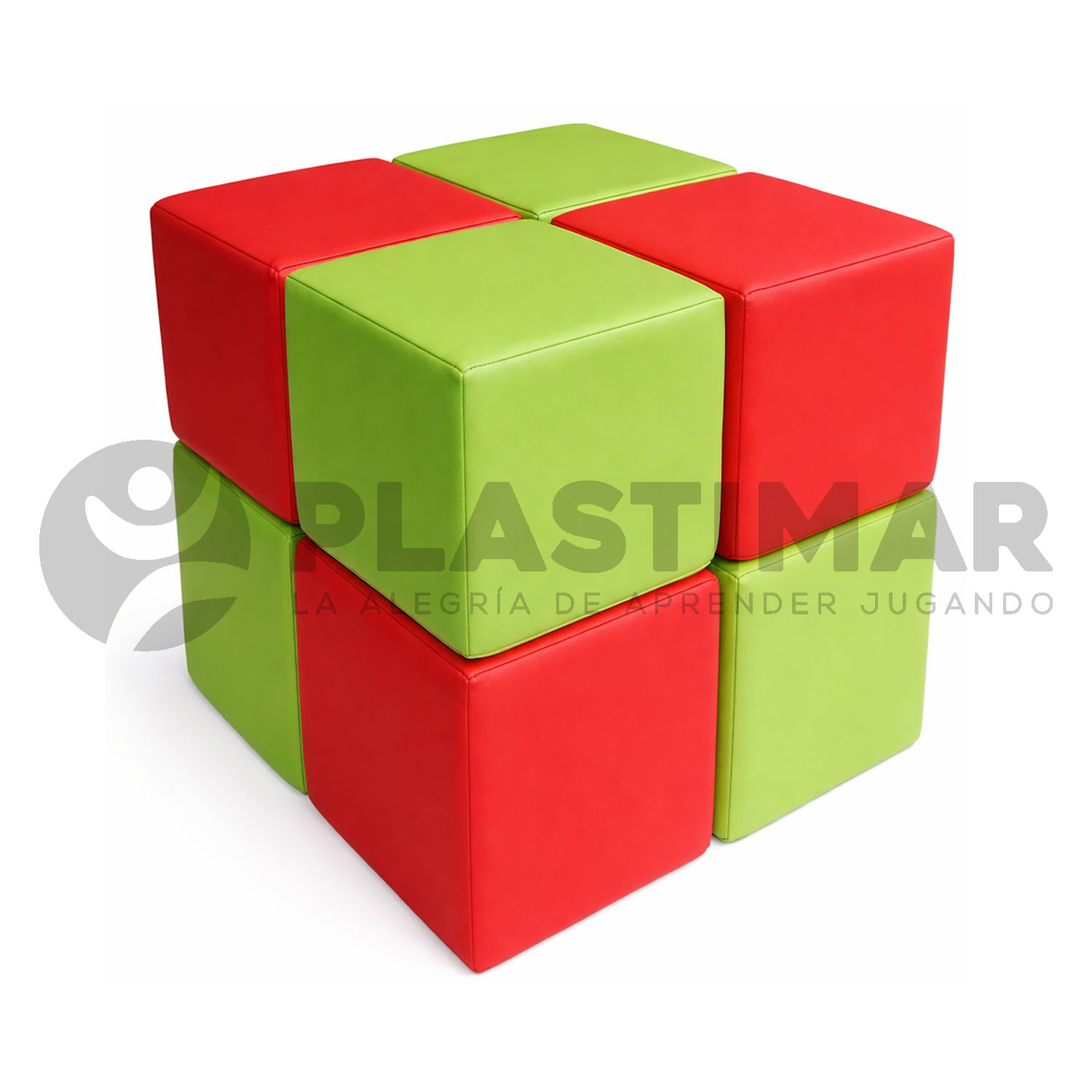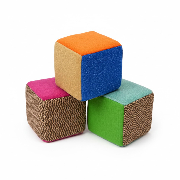Set de cubos con diferentes texturas en cada una de sus caras y sonajeros incorporados, diseñados para estimular el desarrollo sensorial táctil y promover la actividad física en niños y niñas. Sus colores cálidos contribuyen a crear ambientes de confort y exploración.