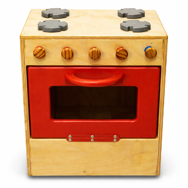 Cocina infantil de madera en color natural y rojo, ideal para fomentar el juego de roles y la creatividad. Cuenta con 4 quemadores y panel frontal con 5 perillas, además de puerta de horno con manilla y ventana acrílica que aporta mayor realismo al juego.