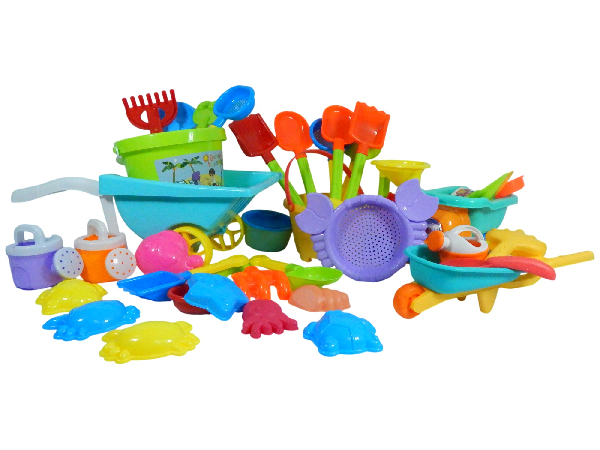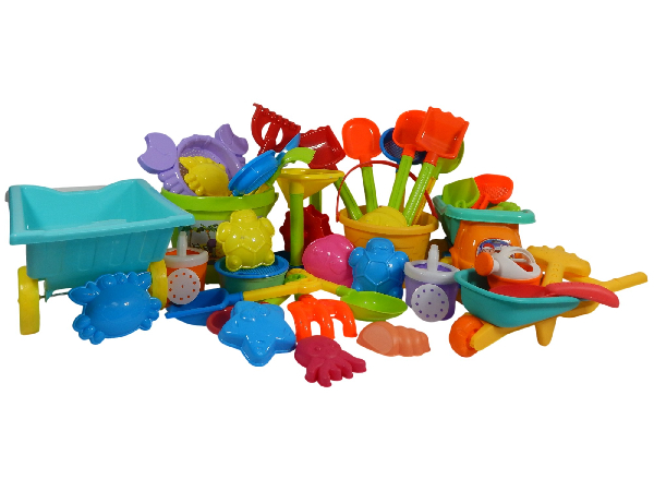 Accesorios de playa como moldes, palas, rastrillos y cubetas en colores variados.