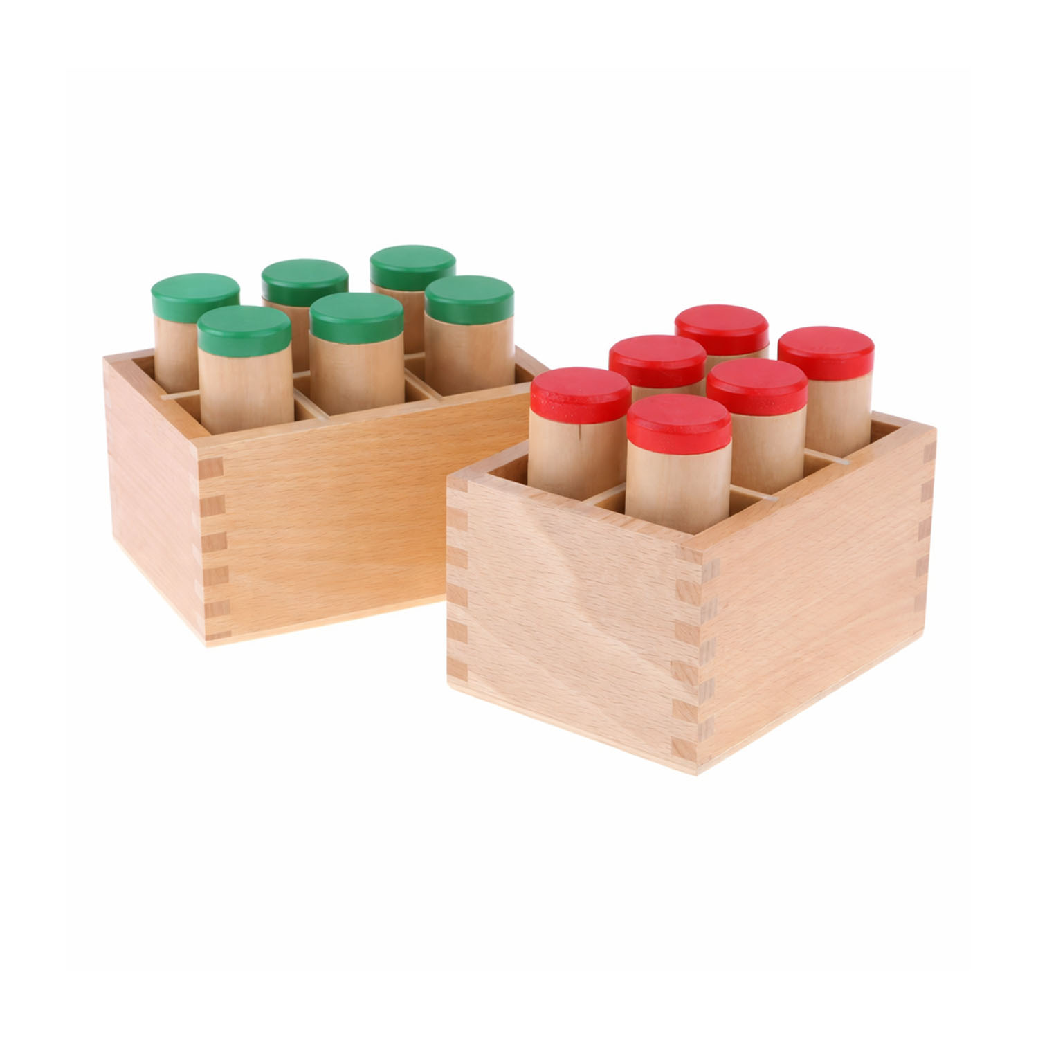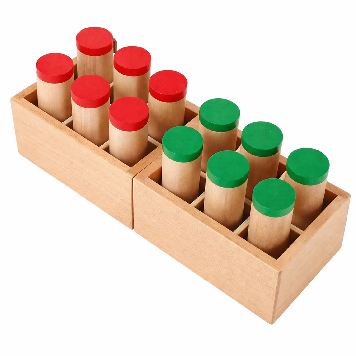 Material didáctico sensorial diseñado para el desarrollo de la discriminación auditiva y la concentración. Permite a niños y niñas identificar, comparar y clasificar sonidos según su intensidad, favoreciendo el desarrollo del oído y el pensamiento lógico.