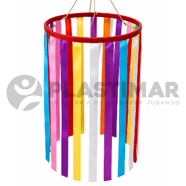 Móvil de cintas Montessori compuesto por un aro plástico y 12 cintas de raso entrelazadas en diferentes colores. Diseñado para estimular la percepción visual y el seguimiento ocular, favoreciendo la atención y la exploración sensorial.