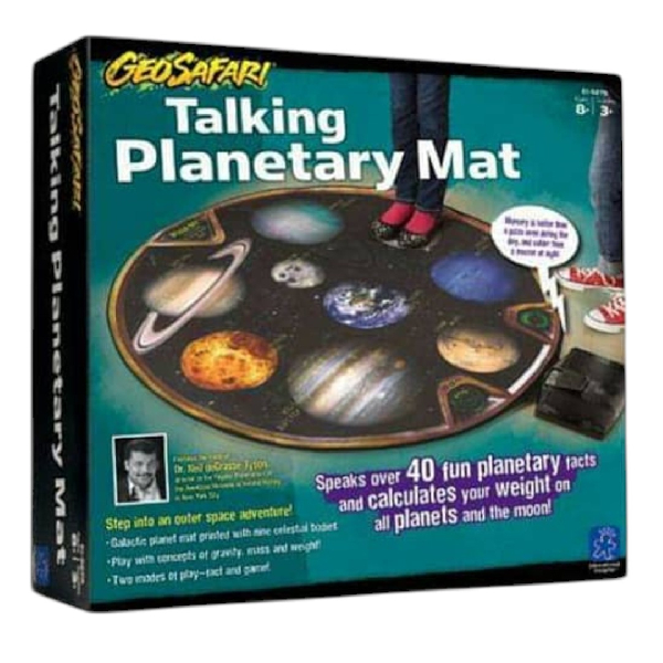 El GeoSafari® Talking Planetaria Mat es un recurso educativo interactivo diseñado para enseñar de forma lúdica conceptos básicos de astronomía, gravedad, masa y peso. A través de la experiencia práctica, los niños pueden descubrir cuánto pesarían en cada uno de los planetas del sistema solar y en la Luna.