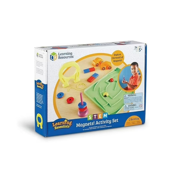 Incluye: 2 imanes magnéticos, 4 imanes en forma de anillo, imán de herradura, poste magnético, 2 autos snap-on, bandeja con laberinto, cadena, 10 tarjetas de actividades de doble cara y guía completa de actividades con materiales reproducibles.