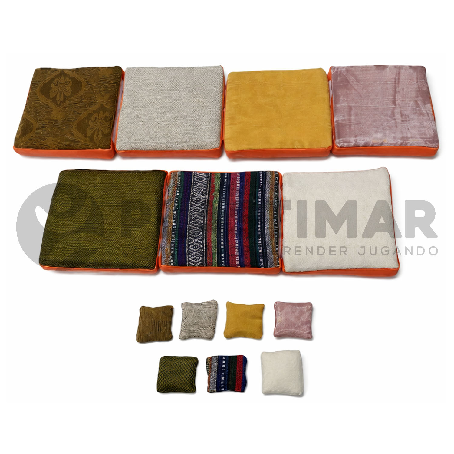 Juego didáctico tipo dominó en formato soft gigante, diseñado para el desarrollo sensorial y la coordinación a través del juego. Sus piezas incorporan diferentes texturas en la cara superior, permitiendo la exploración táctil, mientras que su formato de gran tamaño favorece el juego activo y grupal.