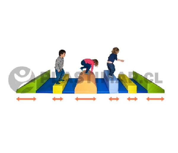 Los obstáculos se fijan a las colchonetas mediante velcros, facilitando el armado y la reorganización del circuito según las necesidades de la actividad. La superficie acolchada y antideslizante aporta estabilidad y contención durante el uso supervisado, promoviendo experiencias de exploración corporal progresivas.
