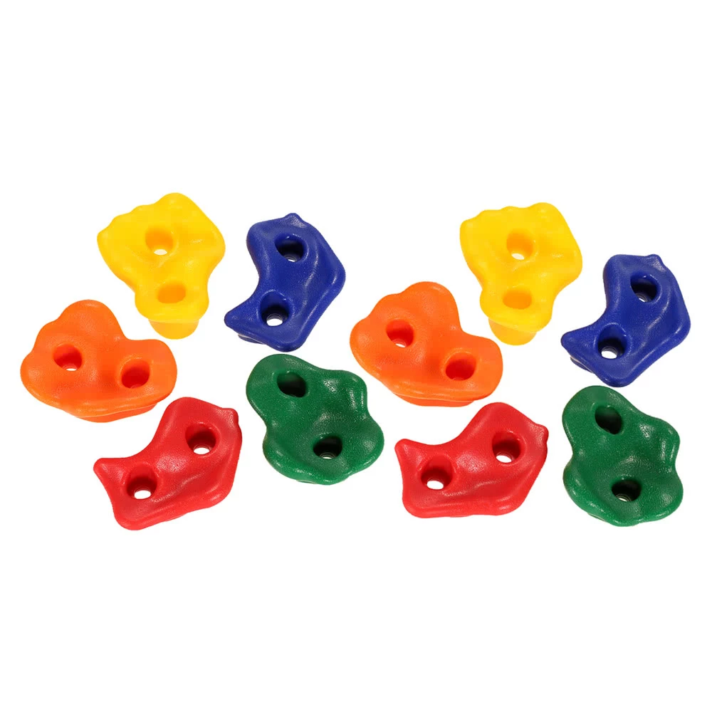 SET 10 PIEDRAS PARA MURO DE ESCALADA Set 10 piezas de piedras para muros de escalada, diferentes tamaños, colores y formas. Desarrolla motricidad gruesa, agarre y movimiento. Ideal para actividades deportivas al interior o exterior, fomenta la vida sana. Incluye pernos. Medidas aprox. 13 x 13 cm. Presentación en bolsa de PVC.