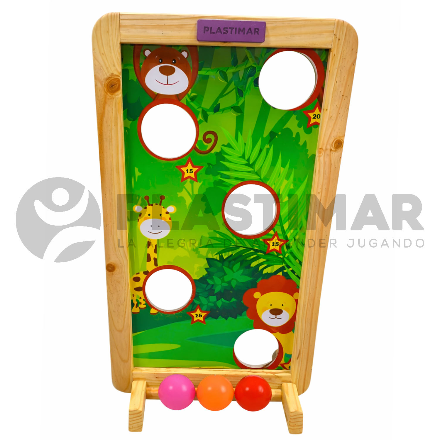 Juego de lanzamiento diseñado en estructura de madera liviana trupan de 5,5 mm, estable y móvil, en sus caras contiene diversas imágenes animadas de animales, de medidas aproximadas 60x100 cm de alto, con apoyo estable, seguro y fácil de transportar. Permite a la niña/o realizar lanzamientos apuntando a orificios que presenta el juego, se incluyen 4 pelotas. Presentación bolsa de PVC.