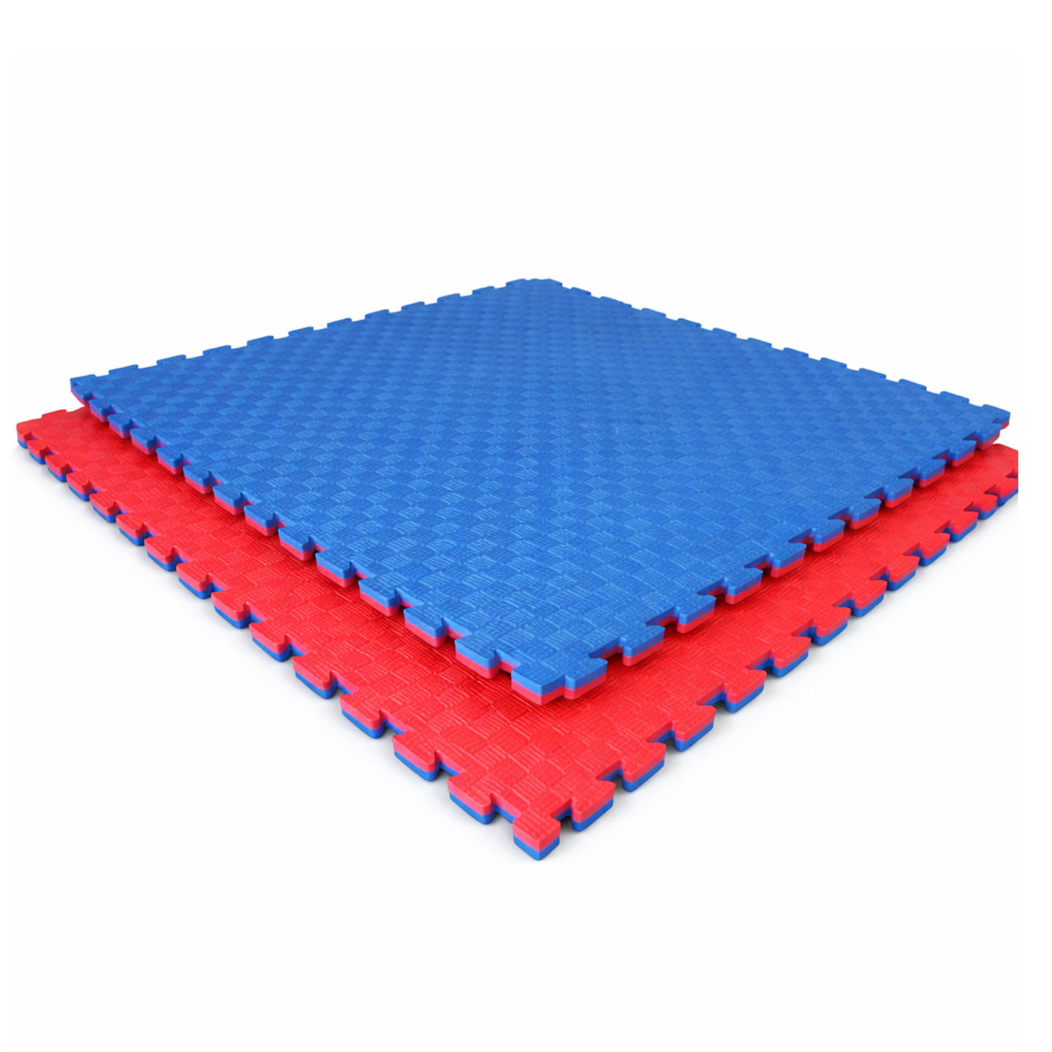 KIT 6 PLANCHAS DE GOMA ENSAMBLABLE 100X100X2.5 CM (TATAMI) Kit de 6 Planchas de etileno-vinilo-acetato, con relieve antideslizante, especial para uso de suelo en prácticas deportivas. Reduce el impacto de saltos y caídas de Artes Marciales y deportes de impacto. Es ensamblable por palmetas lo que permite formar amplias zonas. Fácil de lavar, transportar, no necesita instalación. Alta densidad. Medidas de cada plancha: 100 x 100 x 2,5 cms. de espesor. Color azulino/rojo. Material Goma EVA.