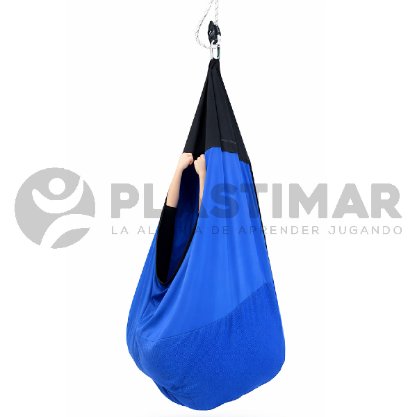Columpio confeccionado en tela suave y elástica, compuesta por 95% algodón y 5% elastano. Material lavable, resistente y de larga duración, que proporciona presión profunda, estimulación propioceptiva y vestibular, favoreciendo la regulación y el aumento de la calma. Su diseño con un lado más alto que el otro permite una sedestación más natural y facilita la postura en flexión.