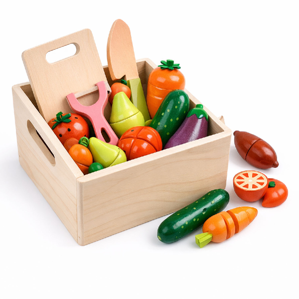 Set didáctico compuesto por piezas magnéticas de madera que representan frutas y verduras, diseñado para favorecer el desarrollo de la motricidad fina, la coordinación óculo-manual y la secuenciación a través del juego simbólico. La acción de cortar y unir las piezas permite explorar la relación causa-efecto, la precisión del movimiento y la organización de acciones.