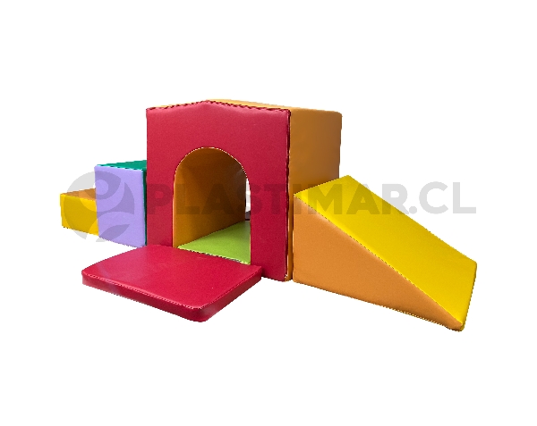 Set diseñado para desarrollar múltiples actividades psicomotoras, nociones básicas, espaciales y temporales, además de fomentar el aprendizaje y el trabajo grupal. Permite ampliar los objetivos físicos de enseñanza generando un espacio seguro para el desarrollo de habilidades motrices. El módulo principal corresponde a un túnel con soporte interior. Las piezas se adhieren entre sí mediante velcros para asegurar su sujeción y estabilidad durante el uso. Incluye bolsa de tela para facilitar su guardado. Marca Plastimar. Fabricación nacional.