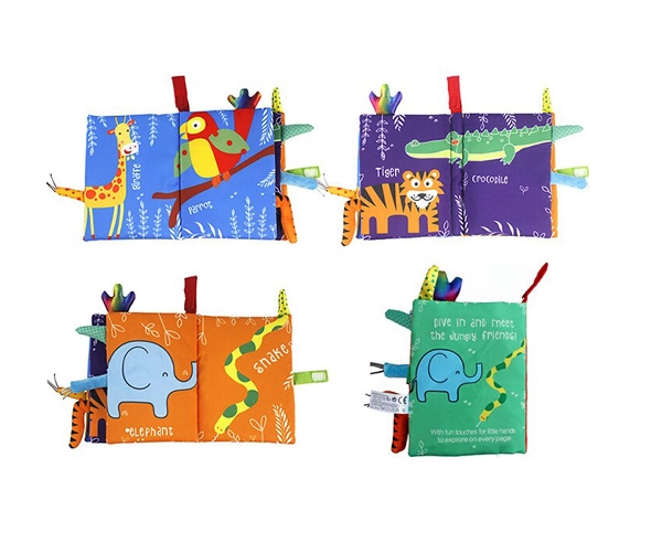 Material didáctico diseñado para la estimulación sensorial temprana en bebés, orientado al reconocimiento de animales de la jungla a través de sus colas. Incorpora diferentes texturas y elementos sonoros que invitan a la exploración mediante el tacto y el sonido.