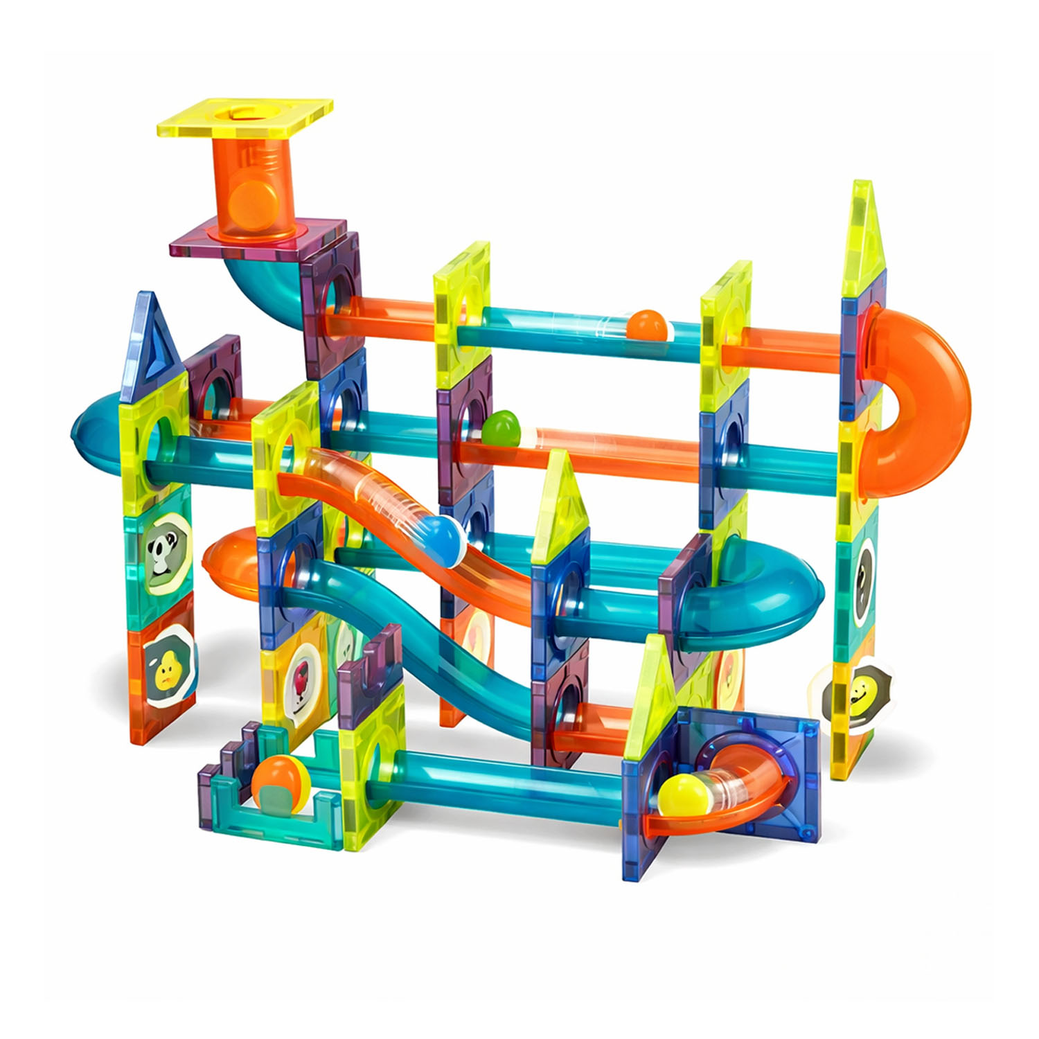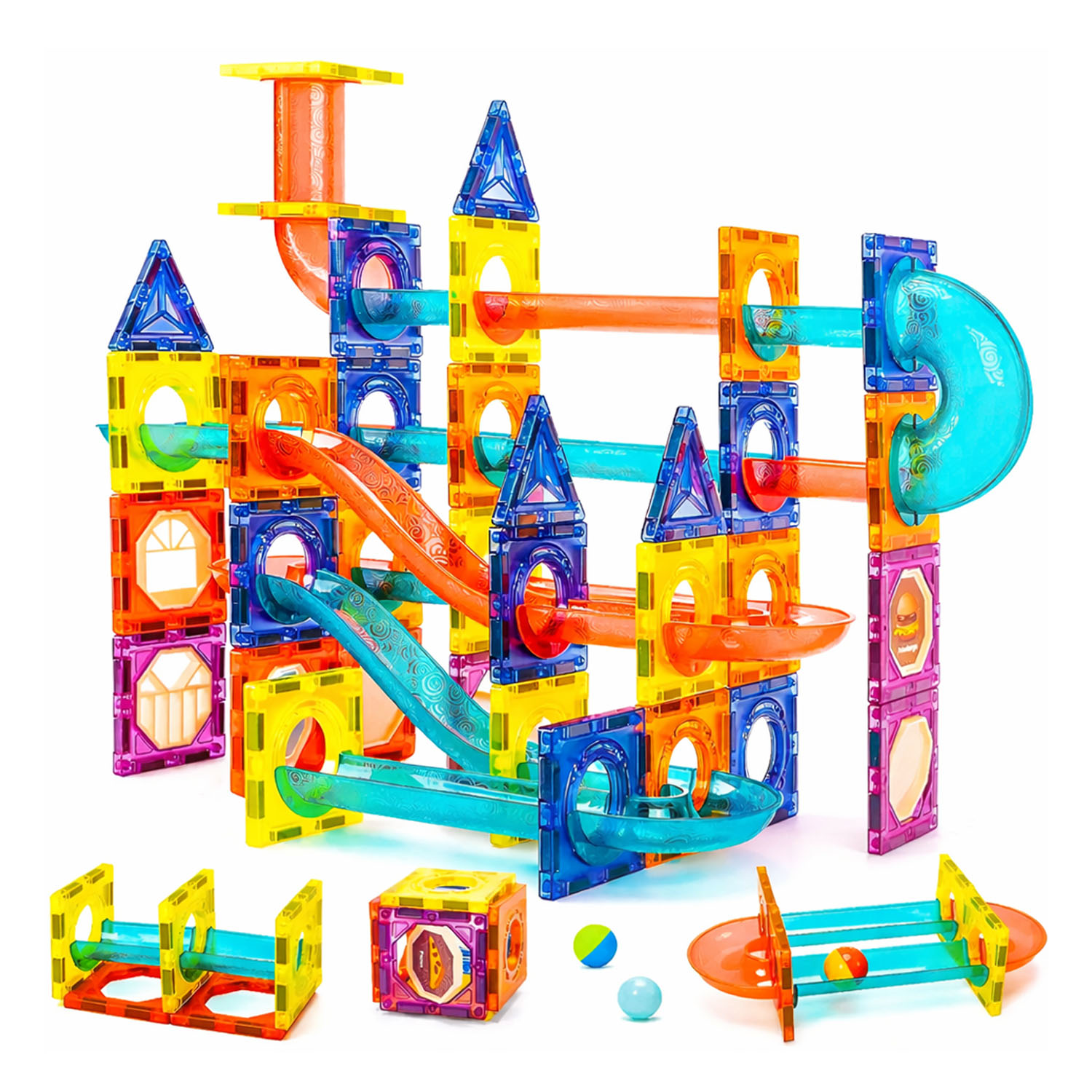 110 piezas entre bloques magnéticos de distintas formas y colores, tubos, bolas de colores, bolas luminosas, pegatinas y guía de uso.