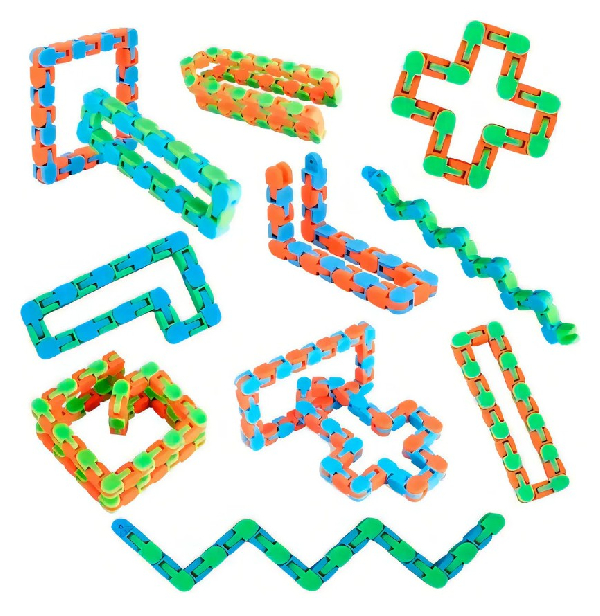 Material didáctico diseñado para la estimulación sensorial y el desarrollo motriz mediante la manipulación continua de sus piezas articuladas. Su formato tipo cadena permite realizar movimientos repetitivos que favorecen la concentración y la calma.